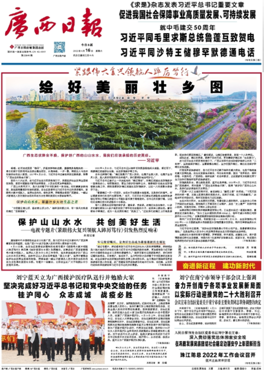 4月15日晚,由自治區黨委組織攝制的電視專題片《緊跟偉大復興領航人踔厲篤行》第四集《繪好美麗壯鄉圖》如期播出。該集講述廣西緊緊跟隨偉大復興領航人,堅持以人民為中心的工作導向,堅決承擔起保護好廣西山山水水的歷史責任,始終牢記讓人民生活幸福是“國之大者”,堅持不懈推動經濟社會發展全面綠色轉型,持續繪就一幅以不斷滿足人民對美好生活的向往為主色調的美麗壯鄉圖。專題片一經播出,立即在全區廣大干部群眾中引發強烈反響。