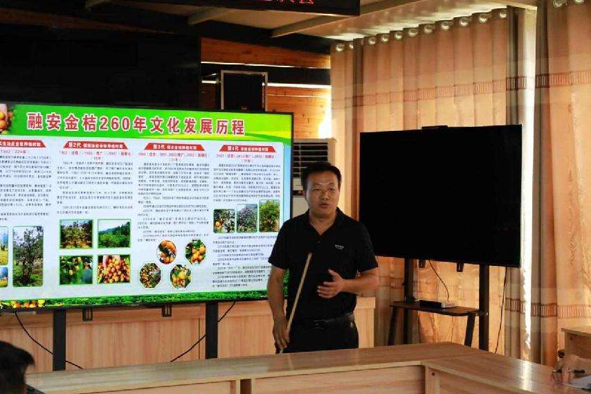 融安縣農(nóng)業(yè)投資開發(fā)有限責任公司董事長韋勛海為隊員們介紹融安金桔歷史。 李永強攝