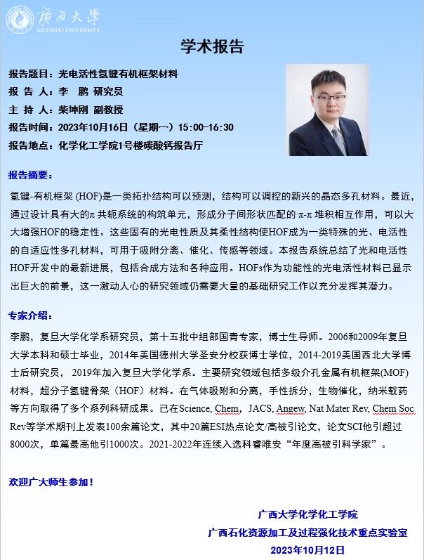 主講人 李鵬研究員 地址 化學化工學院1號樓碳酸鈣報告廳