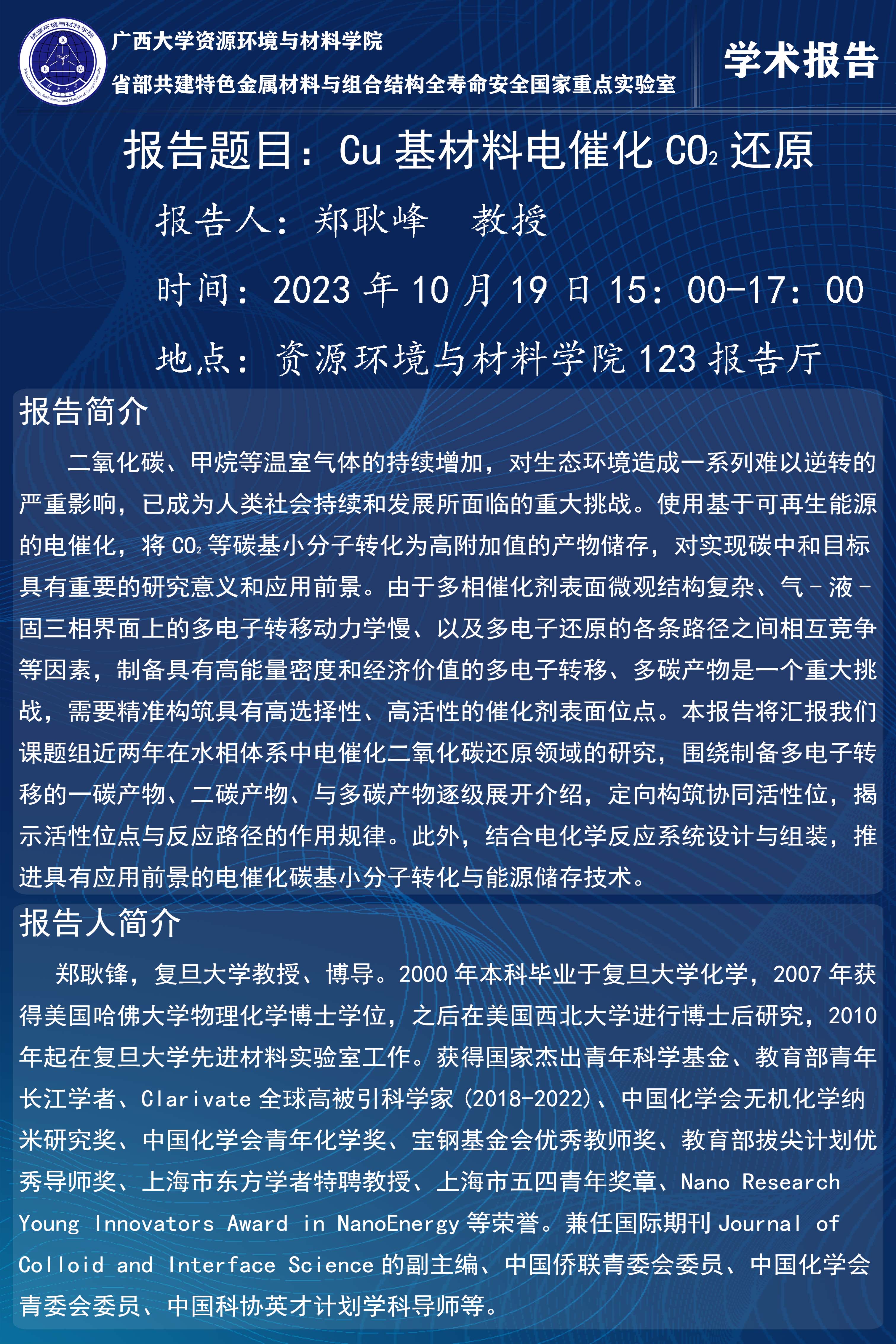主講人 鄭耿峰 教授 地址 資源環境與材料學院123報告廳