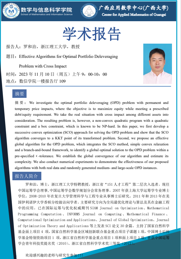 數信學院學術報告:Effective Algorithms for Optimal Portfolio Deleveraging Problem with Cross Impact