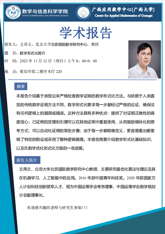 主講人 文再文,北京大學北京國際數學研究中心,教授 地址 數信學院二樓學術廳 220