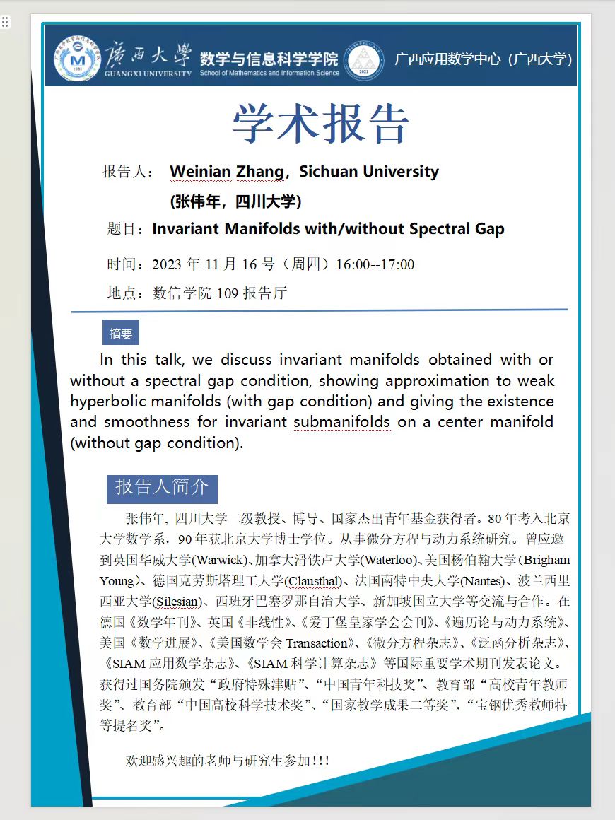 數信學院學術報告:Invariant Manifolds with/without Spectral Gap
