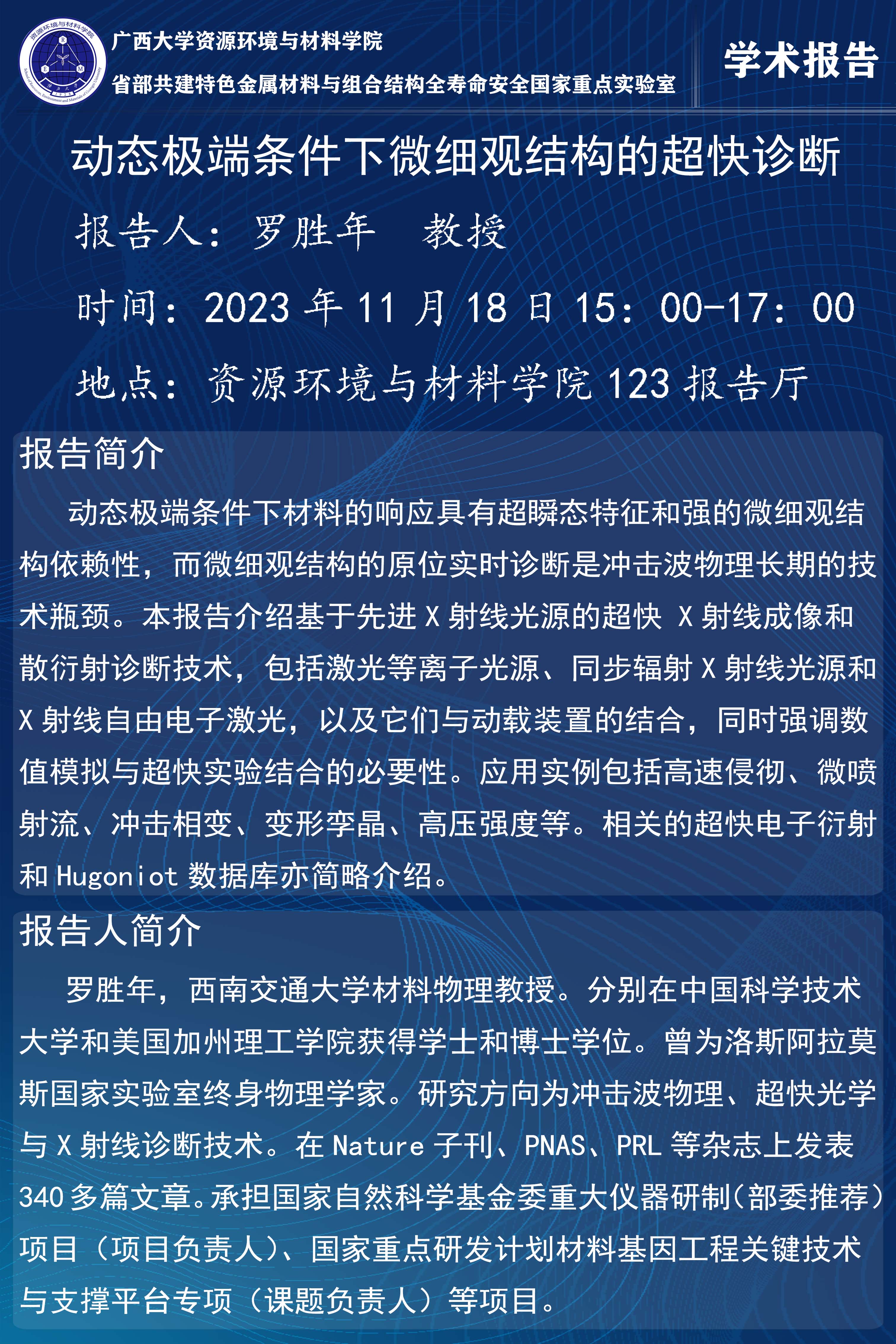資源環境與材料學院學術報告:動態極端條件下微細觀結構的超快診斷