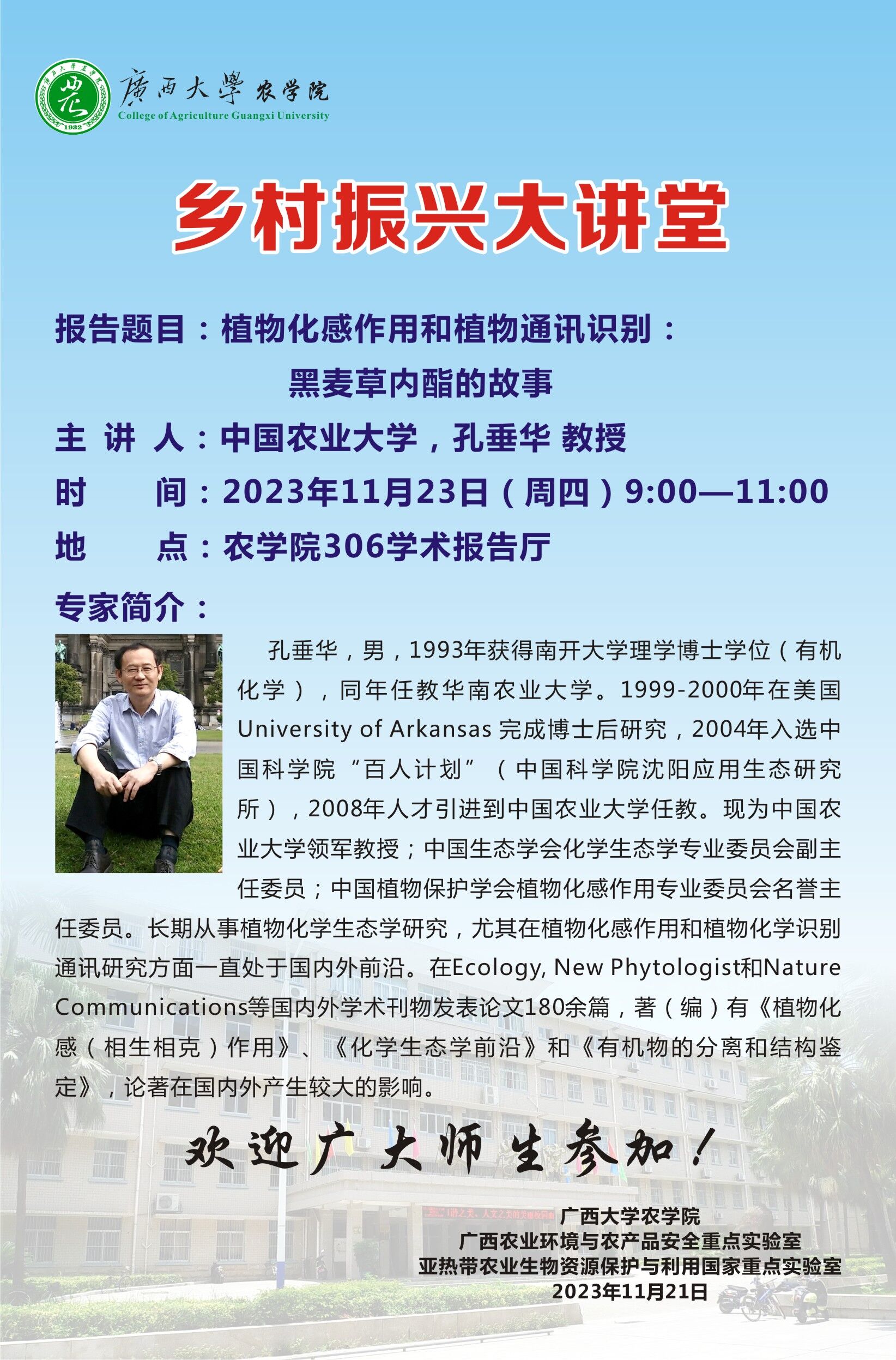 主講人 中國農業大學孔垂華教授 地址 農學院306學術報告廳