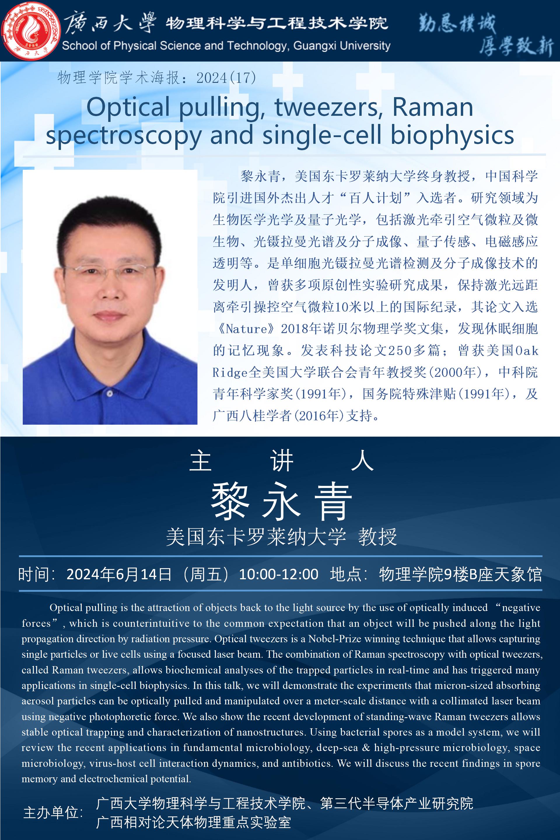物理學院2024年學術報告之17:Optical pulling, tweezers, Raman spectroscopy and single-cell biophysics
