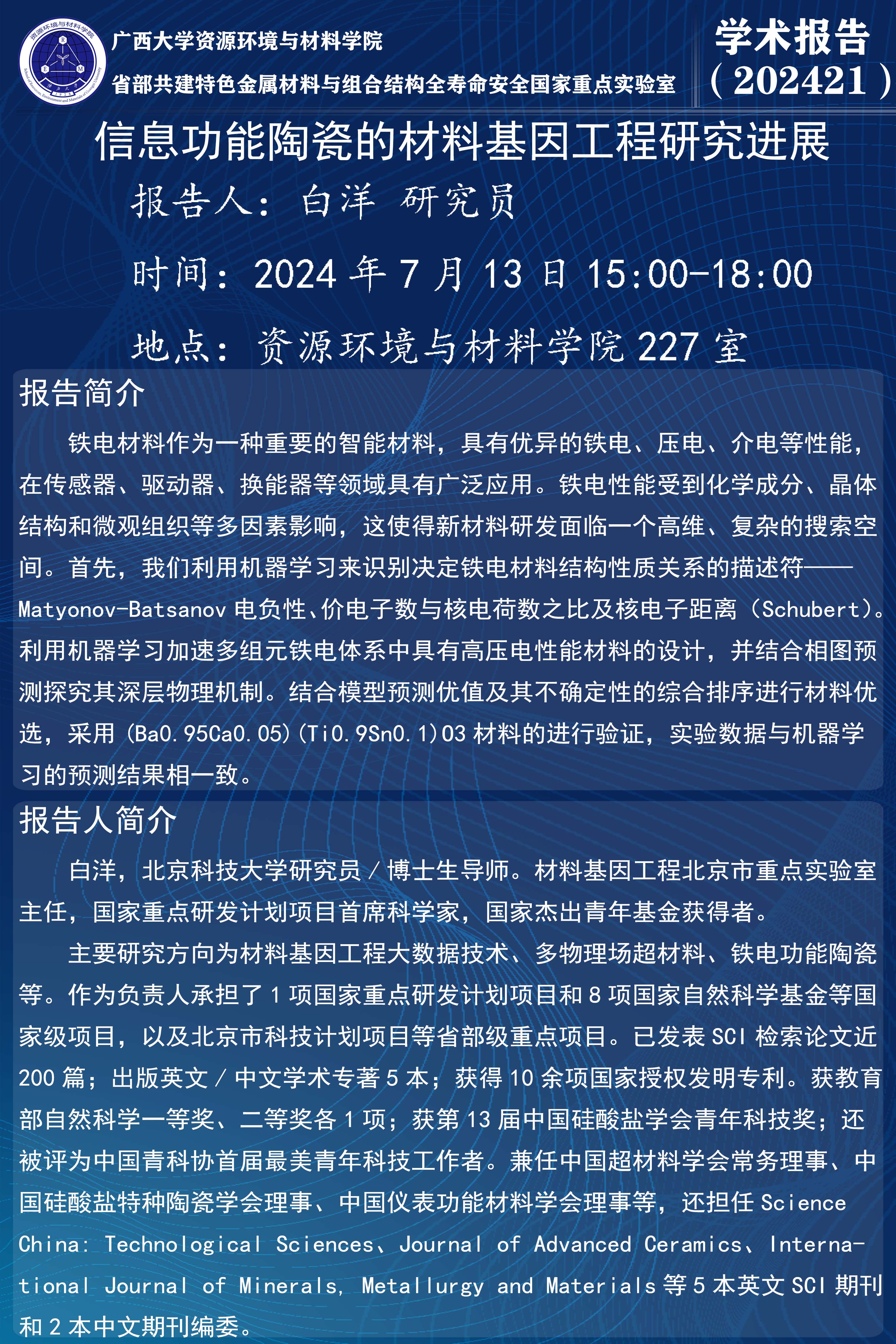 資源環境與材料學院學術報告:信息功能陶瓷的材料基因工程研究進展